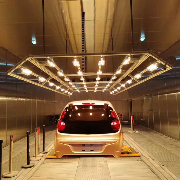 整车模拟环境试验箱依据整车(轿车、轻卡、重卡)环境试验性能测试的工作状态,提供一个标准的温度、湿度、风速、阳光辐照度、新风换气率、尾气废气排放等的模拟自然环境,以满足整车动力匹配,经济性能匹配。 -