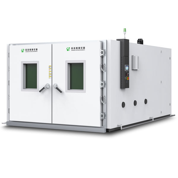 步入式高低温试验箱用于测试大型零部件、半成品、成品,高低温湿热环境下,温湿度变化 对产品、零部件及材料引起的机械性能和化学性能的变化,如体积膨胀、 结构说明 试验箱由2部分组成:保温主箱体和独立的制冷机组组成;底板采用补强设计,底板最大设计承重1000kg;硬质聚氨脂泡沫保温层,厚度=100mm,阻燃等级B2;门框配置两道硅橡胶密封条及防结露电热装置,防止外部结露结霜; 机械强度降低等。 -